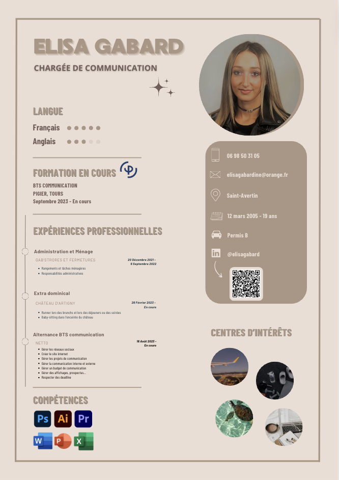 Je me nomme Elisa Gabard, âgée de 19 ans, je suis actuellement en alternance chez Netto en première année de BTS Communication. Mon objectif est de poursuivre mes études en intégrant un Mastère spécialisé en communication et marketing après l'obtention de mon BTS. Je suis une personne à la fois créative et simple, profondément déterminée à réussir. Je ne me décourage jamais.